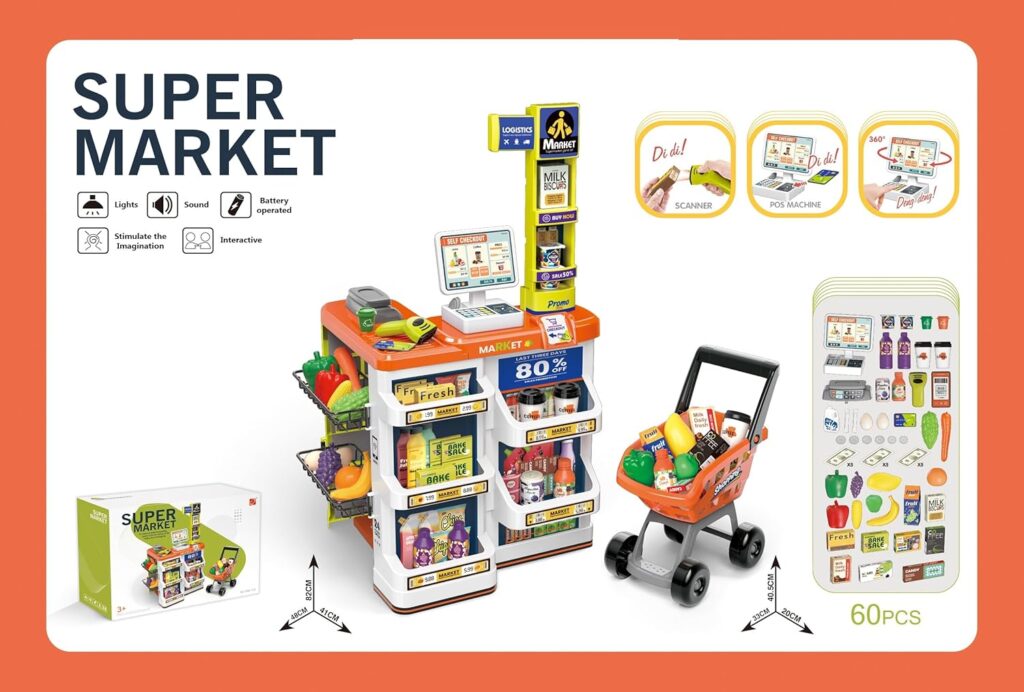 - Accesorios incluidos: Más de 50, incluyendo frutas, verduras, carrito de compras, y caja registradora con escáner.