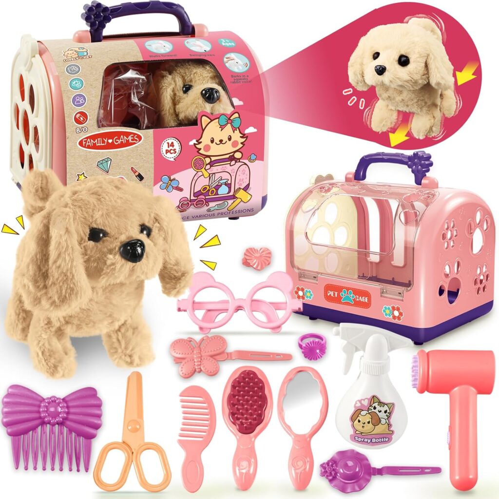 Este juguete interactivo consta de 14 piezas que incluyen un perro de peluche que camina, ladra y mueve la cola. Además, el set incluye herramientas de cuidado como un cepillo, tijeras y productos de aseo. Es perfecto para entretener a las niñas con su dinámica de juego.